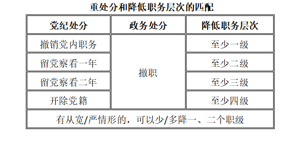 2.對擬給予撤職處分的黨員干部,應按照擬給予其黨紀重處分的不同檔次,即撤銷黨內職務、留黨察看一年、留黨察看二年和開除黨籍等四檔,由輕及重,區別對待,分別提出降低至少一個至四個職務層次的建議。降低職級的幅度應當綜合考慮職務層次和職級之間的對應關系,調整后的職級一般應當為調整后相應職務層次所對應的最低職級。對適用從寬或者從嚴把握情形的,可以少降或者多降一至二個職級。